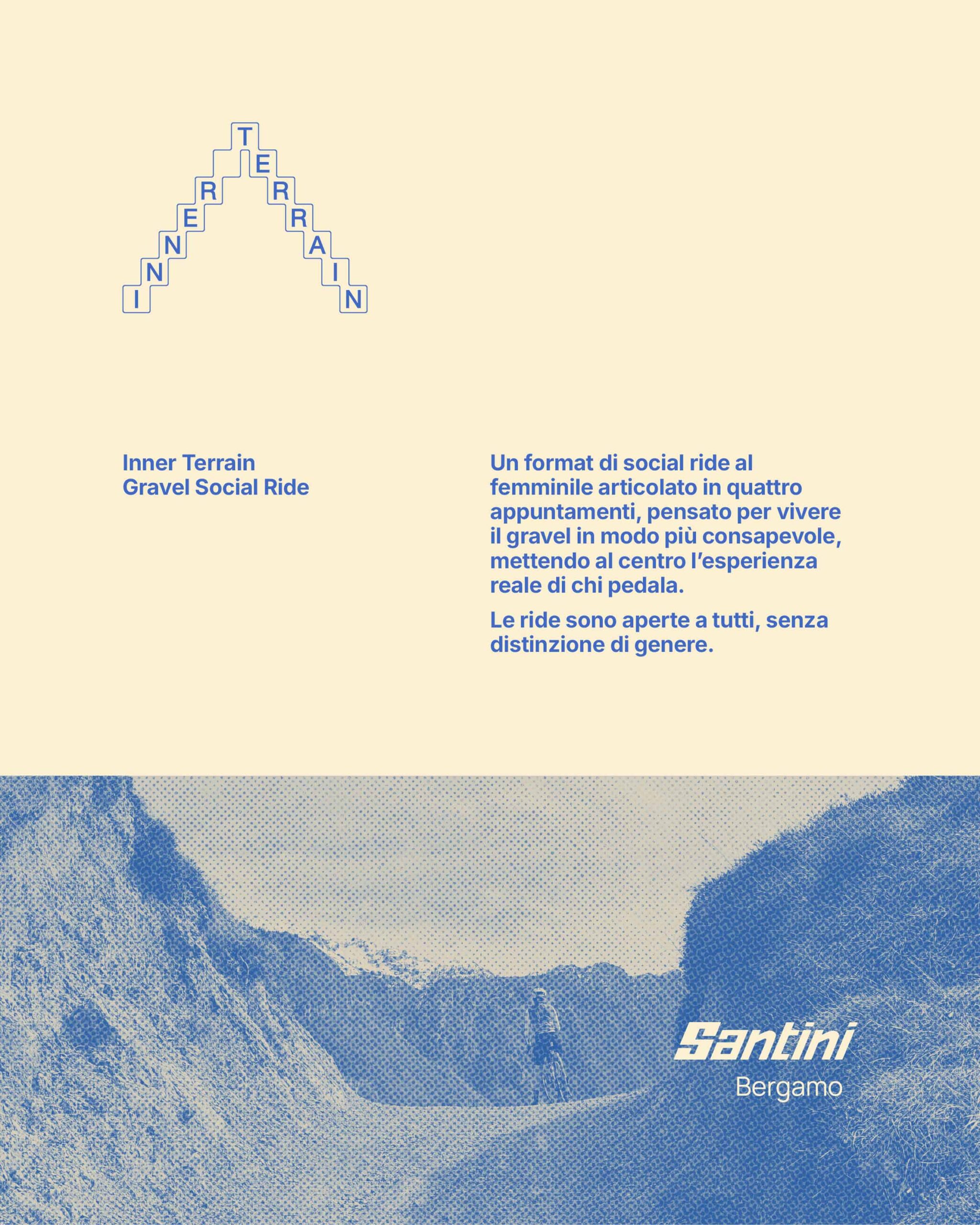 Santini presenta il format di social ride Inner Terrain dedicato alle donne e focalizzato sul mondo gravel. Quattro appuntamenti, a partire dall'11 aprile, legati a diverse tematiche, dall’allenamento, alla nutrizione, dalla preparazione fisica e mentale per le lunghe distanze, all’abbigliamento tecnico.