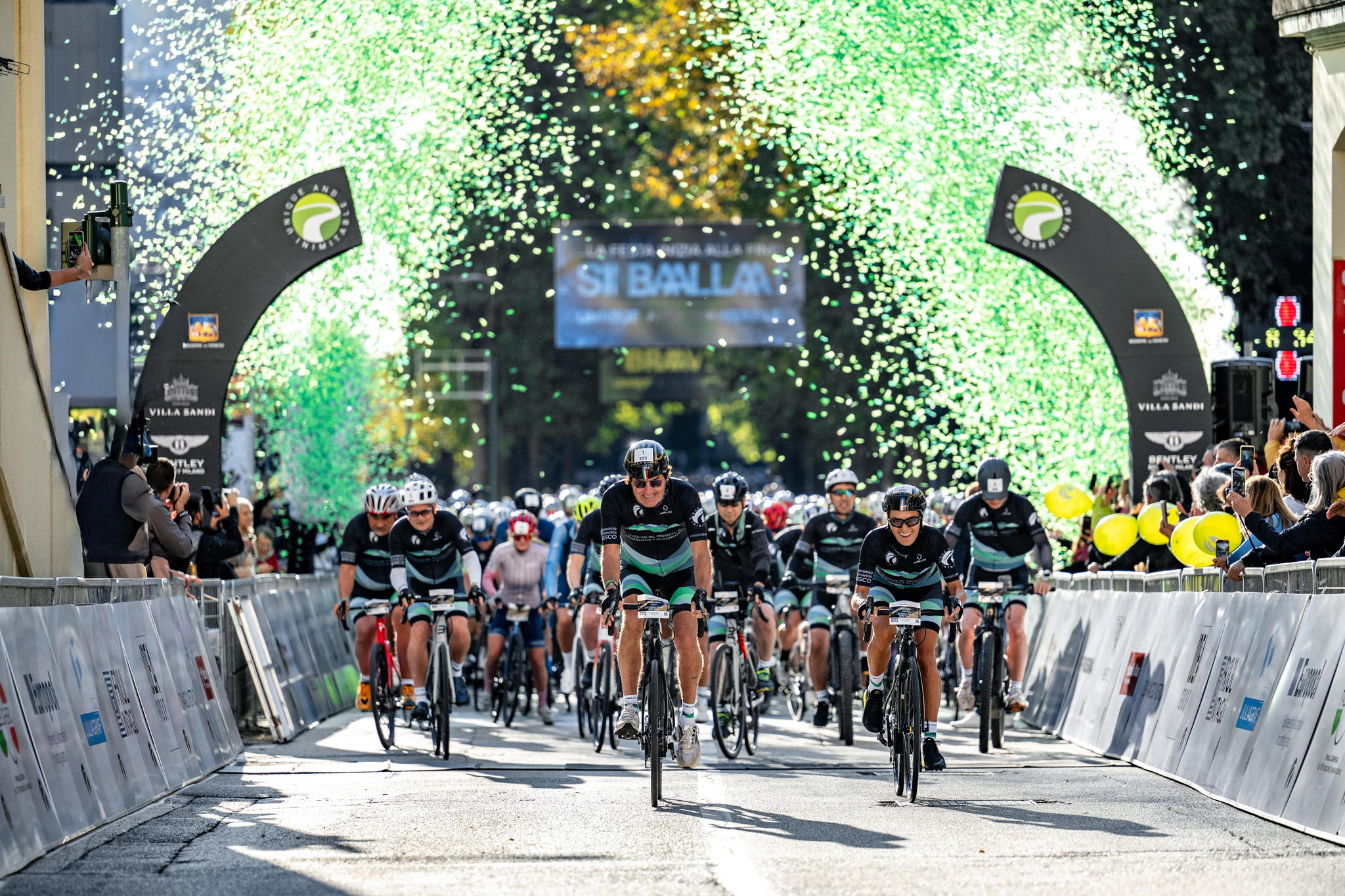 Alle 8.30 in punto, lo start. Un’apoteosi. Coriandoli. Il Tricolore disegnato in cielo dal biplano d’epoca della Jonathan Collection. E poi, immancabile, il “Nessun dorma” di Luciano Pavarotti, la colonna sonora che accompagna le prime pedalate, già in salita, per lasciarsi alle spalle Piazza Marconi.